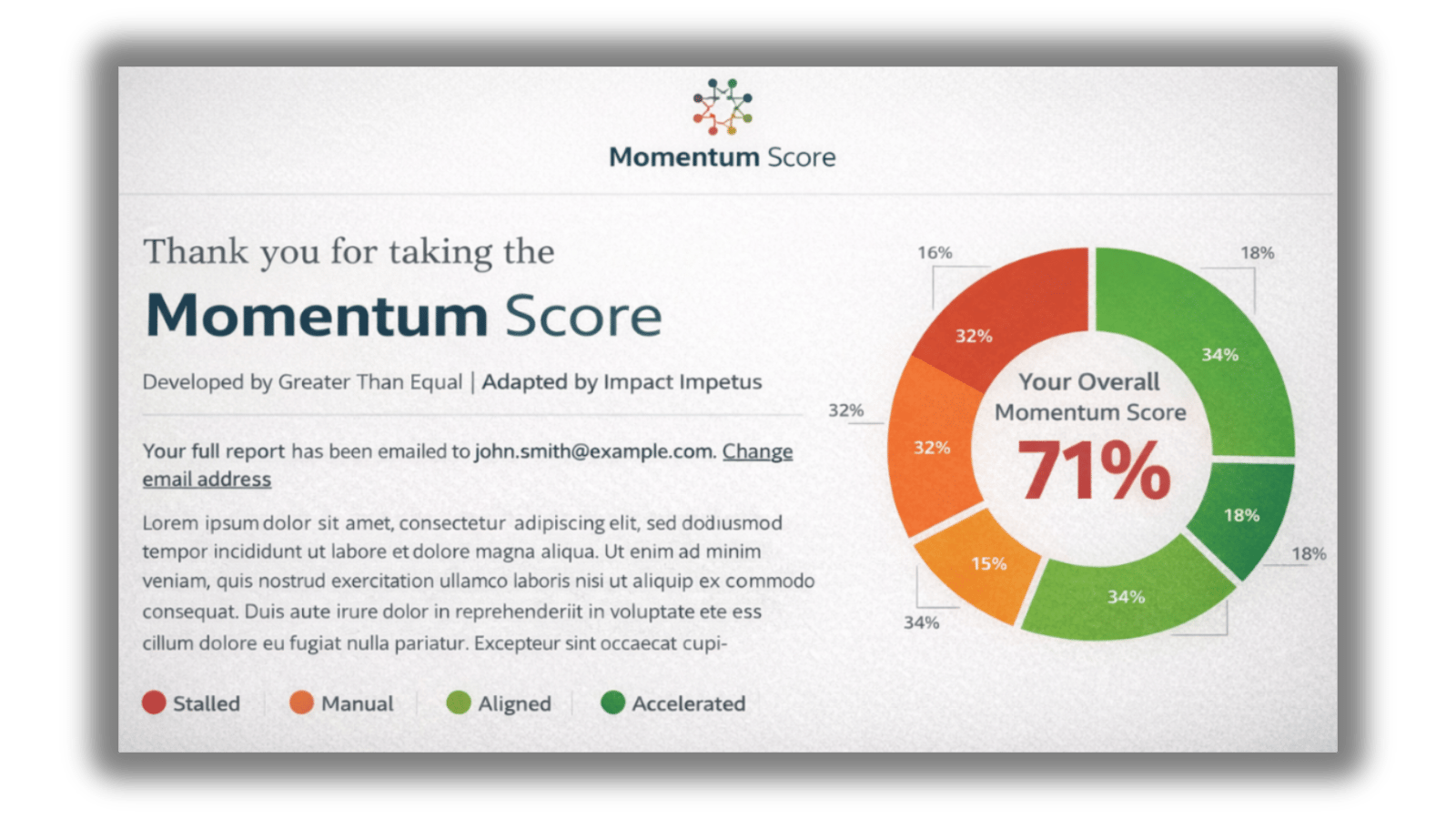 The Momentum Score was adapted by Impact Impetus Media from a Greater Than Equal framework that helps leaders and innovators quickly identify what’s working, what’s weakening progress, and how to strengthen collaboration for maximum impact.
